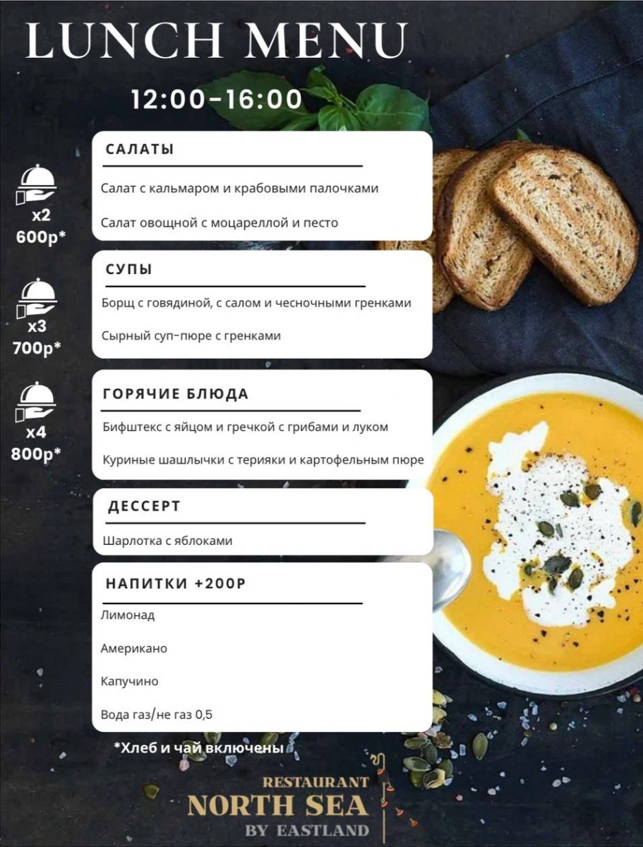 Теперь в будние дни с 12:00 до 16:00 мы предлагаем специальное бизнес-меню для деловых людей.